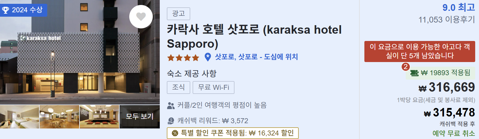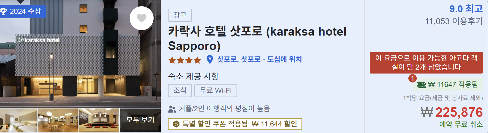 예를 들어, 삿포로 검색하면 자주 나오는 '카락사 호텔 삿포로(kakaraksa hotel Sapporo)' 기준으로 보면,