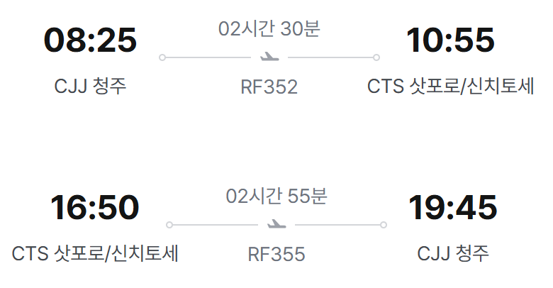 | 항공사 | 출발편 시간 (CJJ → CTS) | 소요 시간 | 복귀편 시간 (CTS → CJJ) | 소요 시간2 | 총 가격 |