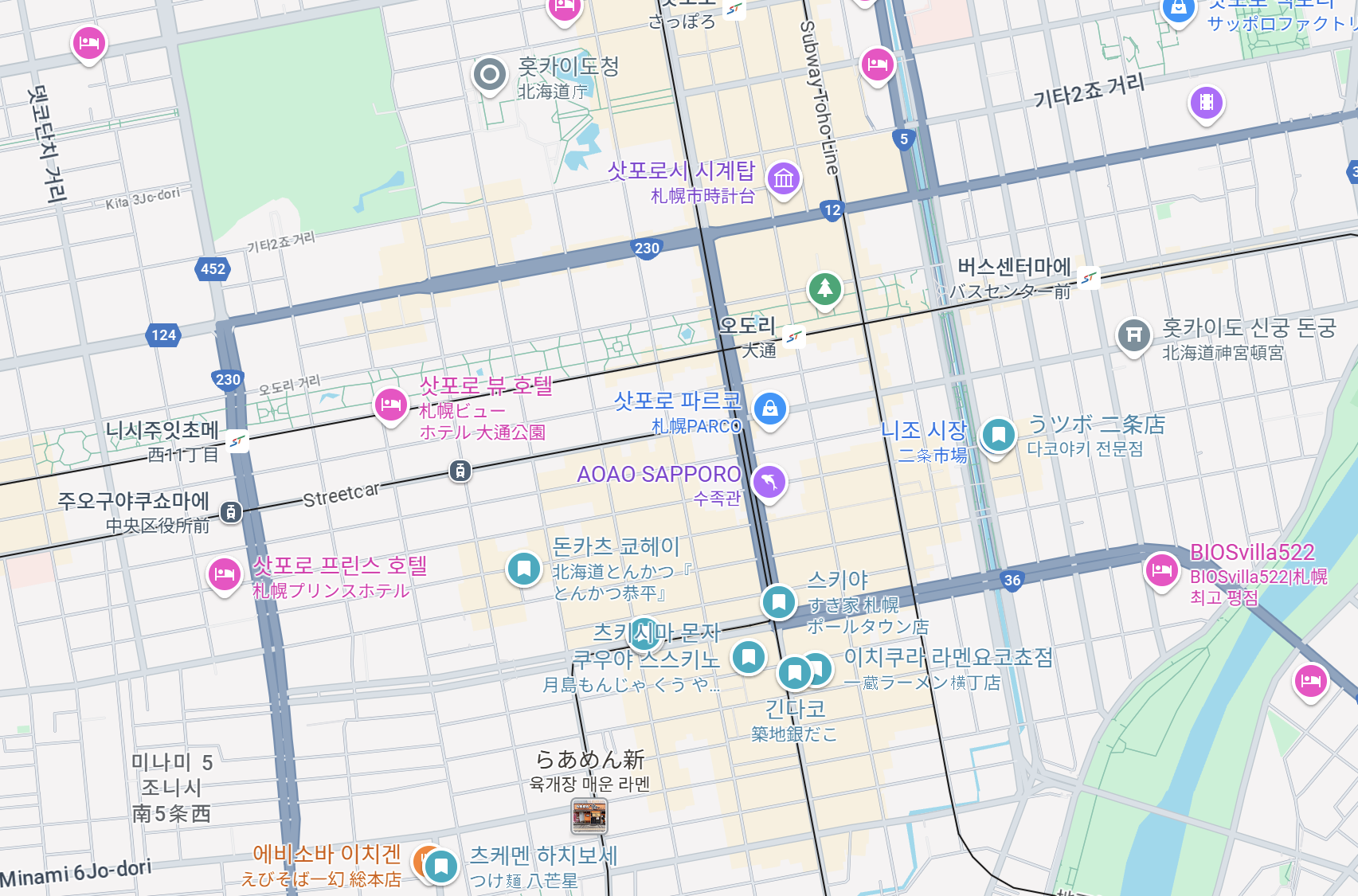 대부분 사람들이 오도리 공원/스스키노 아니면 삿포로역 근처에 숙소를 많이 잡더라고요.
